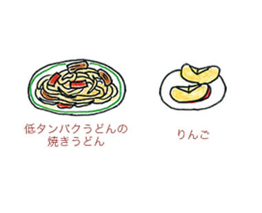 | 朝 | 低たんぱく焼うどん | 562 | 6.1 | 13.7 | 104 | 179 | 1.5 |